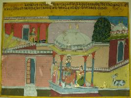 | Description / विवरण | Miniature painting based on Rasikpriya depicting the story of Navajivamugdha. It is a palatial scene, Krishna is depicted sitting with Radha and a chauri bearer near them, a goat is depicted sitting nearby. |