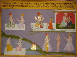 | Description / विवरण | Miniature painting based on Sanskrit drama - Prabodh Chandrodaya depicting a king reaching Varanasi and getting rid of his sins. In the upper part two couple are depicted in loving union. |