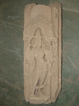 | Description / विवरण | This architectural piece door jamb is having a defaced female deity goddess in tribhangi posture. Beside her two Vyalas mythological animal can be seen. She is shown bejeweled with a prominent breast. Geometrical and floral patterned designs are there. |