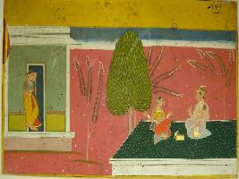 | Description / विवरण | Miniature painting based on Rasikpriya depicting at the left side Nayaka and Nayika sitting on a bed and talking to each other. At the right side a Nayika is seen standing on the door jamb. |