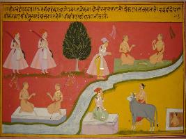 | Description / विवरण | Miniature painting based on Sanskrit drama - Prabodh Chandrodaya depicting Ahankar , at the upper part of the painting, walking and meeting two saints near a river bank. The sages are shown sitting in the lower part also, at the bank of a river. In the other bank of the river, a man is sitting on an asana in front of whom a Brahman is standing with a cow. |