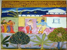 | Description / विवरण | Miniature painting based on Rasikpriya, depicting both Nayak and Nayika meeting with each other in the palace. Scene here depicted is of forest in which an elephant is moving, a peacock is sitting and monkies are resting on the tree. |
