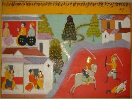 | Description / विवरण | Miniature painting based on Sanskrit drama - Prabodh Chandrodaya depicting at the lower left side Maharaja Kiratveer in battle with enemies. The right side depicts the king sitting in front of two men, and below it his subjects are depicted living a happy life. |