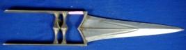 | Description / विवरण | Katar dagger having straight pointed blade with grooves. The handle is M shaped with two bhoglis. |