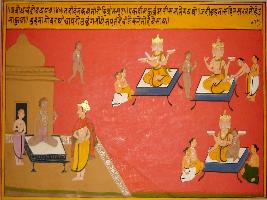 | Description / विवरण | Miniature painting based on Sanskrit drama - Prabodh Chandrodaya depicting a Brahman is depicted with his son and a wealthy person on one side. The Brahman is seen walking to Brahma, talking to him and sitting with him in his throne. |