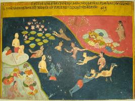 | Description / विवरण | Miniature painting based on Rasikpriya depicting river Yamuna, full of lotus blooms and Krishna and Radha swimming and playing with other gopas and gopis. |
