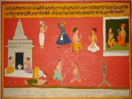 | Description / विवरण | Miniature painting based on Sanskrit drama - Prabodh Chandrodaya depicting Dambha telling to a female that Kama and Krodh are under his influence and in order to release from these, people should worship Shiv. |