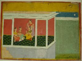 | Description / विवरण | Miniature painting based on Rasikpriya depicting four well dressed Nayikas, three sitting and one standing, in the palatial balcony. |