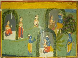 | Description / विवरण | Miniature painting based on Rasikpriya depicting the holy union of Krishna and Radha in a bower. It is an incomplete painting. |