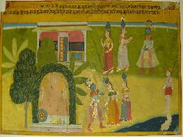 | Description / विवरण | Miniature painting based on Rasikpriya depicting Radha and a gopi carrying water pitchers on their heads and Krishna in the upper left corner, while in the lower part Krishna is taking away the pitcher of Radha. The painting expresses the immortal love of Krishna and Gopis. |