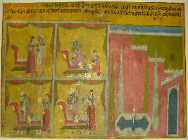 | Description / विवरण | Miniature painting based on Rasikpriya depicting Nayaka and Nayika in four panels. In the upper right part both Nayak and Nayikas are seen in a loving union, while the other three panels depicts Nayika serving Nayaka. In the right side, depiction of the outer view of the palace. |