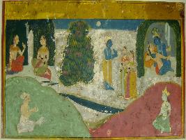 | Description / विवरण | Miniature painting based on Rasikpriya depicting Radha seated and talking to a friend. On lower right part a priest with his book is depicted. On upper part Krishna is shown talking with Radha and a gopi, Next to it Krishna and Radha in loving union. A male deity is seated alone on lower left corner. |