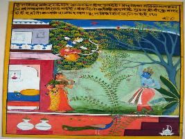 | Description / विवरण | Miniature painting based on Rasikpriya depicting Vichitra Vivrama Purush Lakshana . The painting depicts Krishna holding a branch of a tree and Radha is walking towards him. Rati devi is seen pointing her arrow towards Krishna. |