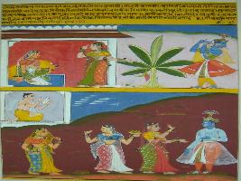 | Description / विवरण | Miniature painting based on Rasikpriya depicting Radha sitting in her palace and in front of her friend is shown standing and talking at upper right part. To its left Krishna is shown playing flute. At the middle right part, Keshav Das poet is depicted sitting and narrating this scene. At the lower level, Radha with gopis are shown standing with Krishna. |