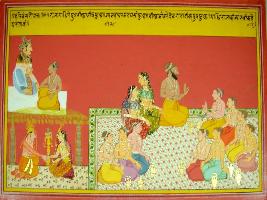 | Description / विवरण | Miniature painting based on Harivansha depicting that Vishwamitra was son of king Gadhi. Gadhi married his son to the daughter of king Rachik. Later Vishwamitra got sons like Devrat etc. |
