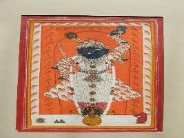 | Description / विवरण | It is a painting of Srinathji shown holding a lotus bud and in one arm white flute is set into his waist, with a long garland a flower in another arm. The blue god is wearing feathered crown. |