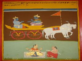 | Description / विवरण | Miniature painting based on Shri Bhagwat Gita. It depicts Krishna preaching Arjun that intelligence and patience are very sophisticated and one should be careful with it. |