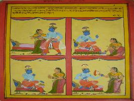 | Description / विवरण | Miniature painting based on Rasikpriya depicting Radha serving Krishna by offering him asana , washing his feet, offering him water and blowing a fan respectively depicted from upper right side. |
