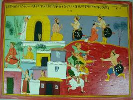 | Description / विवरण | Miniature painting based on Harivansha depicting story at Raja Sagar. He is talking with a sage in the upper part. In the lower side he is battling with four men. |