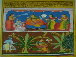| Description / विवरण | Miniature painting based on Rasikpriya, divided into two parts. In upper part, Radha is depicted adorning herself with the help of many female attendants and getting prepared to meet her lover. In the lower part, She is shown waiting for Krishna in the garden and admiring herself in the mirror, while Krishna is approaching towards her. |