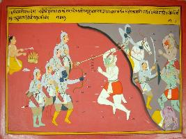 | Description / विवरण | Miniature painting based on Harivansha depicting the war between Pandavas and demons Nikumbha and Aurpan. At the extreme left, Arjun is shown riding on horse and shooting arrows on demons. At the upper right portion, a sage is shown performing yagna. |