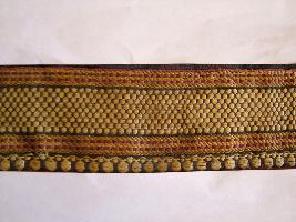 | Description / विवरण | It is a Chinese border made in Bombay. Designed with circular shaped circles with all floral pattern with silver thread work. The border is divided in two sections with mustard colour horizontal line. The upper portion is carrying geometrical design. |