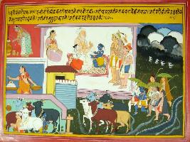 | Description / विवरण | Miniature painting based on Harivansha depicting some scenes from Gokul presenting the childhood days of Krishna. Yashoda is making Makhan . Nanda and Yashoda are sitting with Krishna and Balram and talking to three gopas. Krishna and Balram are shown milking cows and herding cows in a rainy day. |