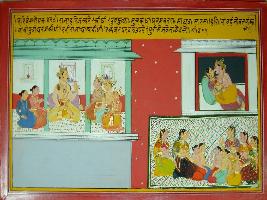 | Description / विवरण | Miniature painting based on Harivansha depicting Raja Harish with his five sons, who are born from five Madhuban Kanyas. In the left part, the king is seen in a loving union with his wife and in the lower part, the wives sitting with their sons. |