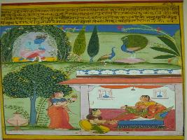 | Description / विवरण | Miniature painting based on Rasikpriya depicting Krishna in upper portion sitting in the garden in a very sad mood. While in the lower part Radha is seen sitting on throne and two females are serving her. Both Krishna and Radha are in very sad mood due to separation. |