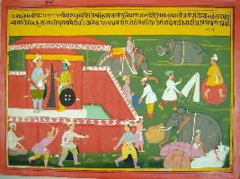 | Description / विवरण | Miniature painting based on Mahabharat - Udyam parva depicting Pandavas are camping near war field. king Yudhisthir is seen talking to Krishna outside the tent, warriors and soldiers are seen putting up tents and elephants are carrying goods. |
