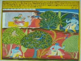 | Description / विवरण | Miniature painting based on Rasikpriya describing the love sick Krishna. Krishna is suffering from the separation with Radha and wandering in Vrindavan. A female friend of Radha comes to deliver her about his condition. |