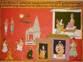 | Description / विवरण | Miniature painting based on Sanskrit drama - Prabodh Chandrodaya depicting two males standing in upper right and two persons seated in the lower right corner. In the upper left part, a king is seated with two persons and in lower left part, mating scene of a couple is depicted depicting that looking on other s wife is a sin. |