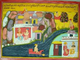 | Description / विवरण | Miniature painting based on Harivansha depicting a sea and a king coming by boat and settles there by making a palace and a city. |