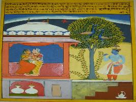 | Description / विवरण | Miniature painting based on Rasikpriya depicting Radhika embracing her friend with joy and Krishna is shown standing at her doorsteps. Two peacock are depicted sitting on tree. |