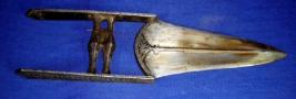 | Description / विवरण | Iron Katar Dagger having broad blade with embossed floral motif and handle with two bhoglis and embossed floral work. |