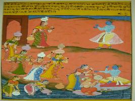 | Description / विवरण | Miniature painting based on Rasikpriya depicting Gopis filling water from river and Krishna playing with them and cracking their pitchers. |