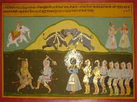 | Description / विवरण | Miniature painting based on Mahabharat - Gada parva depicting vigorous fight between Duryodhan and Bhim as if two elephants are fighting. Krishna and other Pandavas are watching the battle. |