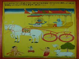 | Description / विवरण | Miniature painting based on Shri Bhagwat Gita. It depicts Krishna preaching Arjun that among all living beings, one who watches Brahma with his supreme knowledge then that knowledge becomes satvik. |