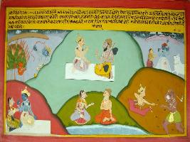 | Description / विवरण | Miniature painting based on Harivansha depicting that Indra talking to Narad and telling him that Parijaat is not for earth it is only for heaven. In three corners of the painting Krishna Lila are depicted- the Khandav Dhon, Govardhan lifting, Krishna sitting with Satyabhama, in the fourth corner Indra is seen fighting a demon. |