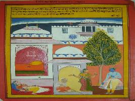 | Description / विवरण | Miniature painting based on Rasikpriya depicting Krishna coming to meet Radha who is angry with him and lying inside the house. Krishna speaks to Radha s friend, and says that he wants to go to the garden with Radha. An old man is seen with them. |