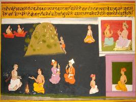 | Description / विवरण | Miniature painting based on Sanskrit drama - Prabodh Chandrodaya depicting In the right side two Vidyadhars, a boy climbing a mountain on fire, two persons enjoying drink and two Brahmans performing yagna are depicted. In the left part, a king talking to his minister, a man sitting in a house and another man sitting outside are depicted. |