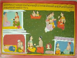| Description / विवरण | Miniature painting based on Harivansha depicting a lady seated with a man in the house. Below them, a man is embracing a lady and a person lying besides them. Near them, a woman is giving alms to a sage. In the left side, a woman is talking to three women. Below them a couple is seen talking. A couple is going to heaven in a viman in the top. |