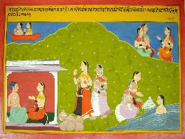 | Description / विवरण | Miniature painting based on Harivansha depicting that the women who take holy bath, worship Shiv, serve their parents and husbands, go to the Heaven after death. |