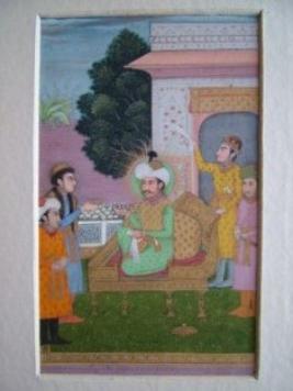 | Description / विवरण | A mughal emperor is sitting on a golden throne. A person standing him from behind, wearing a green,golden cloth. |