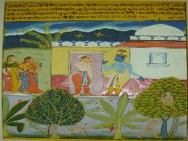 | Description / विवरण | Miniature painting based on Rasikpriya depicting Krishna standing and talking to a man in a palace at the middle of the painting. At the extreme right, Radha with her friend is shown standing. At the lower part, garden is depicted, with monkeys and dear around trees. |