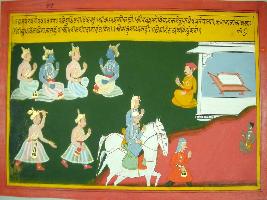 | Description / विवरण | Miniature painting based on Mahabharat - Udyam parva depicting Krishna telling Yudhisthir that Kaurava army left for Kurushetra with the bravery of Bhim and Arjun in their mind. |