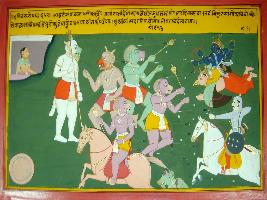 | Description / विवरण | Miniature painting based on Harivansha depicting war between Vishnu, sitting on Garuda and demons named Kumbha and Nikumbha. At the top right, a woman is shown watching. |