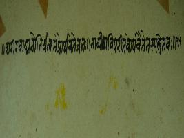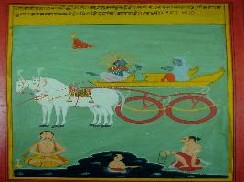 | Description / विवरण | Miniature painting based on Shri Bhagwat Gita. It depicts Krishna preaching Arjun that a human starts Karma with body, speech and mind and there are 5 reasons behinds motivation for Karma and those five reasons are 5 senses. |