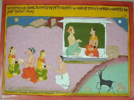 | Description / विवरण | Miniature painting based on Harivansha depicting day and night and a man talking to a woman and telling her about different danas. A woman is shown giving swarna daan to a man and tamra daan to another man. A deer and rabbits are depicted in the lower left corner. |