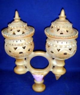 | Description / विवरण | Two terracotta smoking pots with lids on a circular stand. The lids and pots are decorated with cut work and punched designs. Bottom of one pot is broken. |